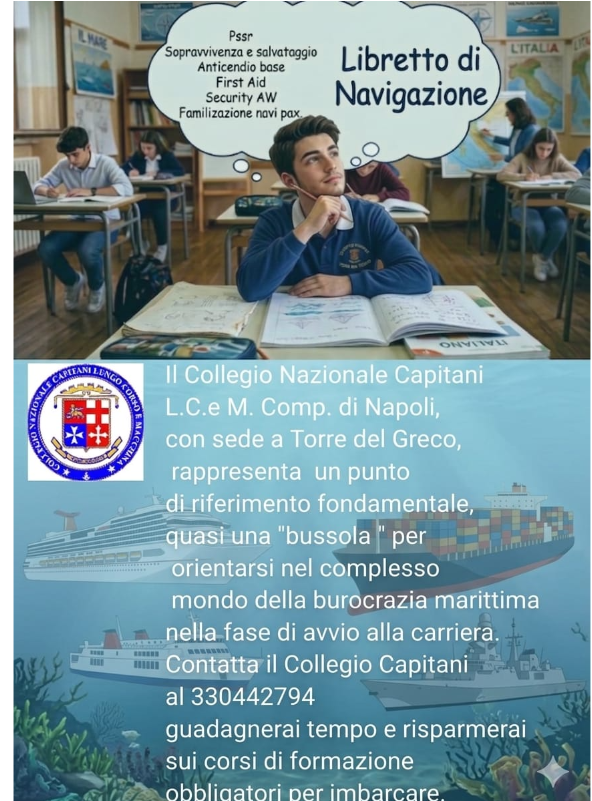 La locandina diffusa in questi giorni sottolinea proprio questo ruolo: un sostegno concreto per affrontare corsi obbligatori, familiarizzazione con le normative, sicurezza, antincendio, primo soccorso e tutto ciò che costituisce la base della vita di bordo. Un messaggio chiaro rivolto agli studenti del Nautico, che trovano nel Collegio una “bussola” affidabile per orientarsi nel mondo marittimo.