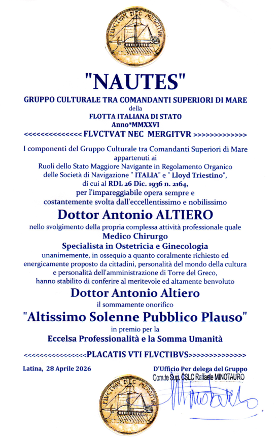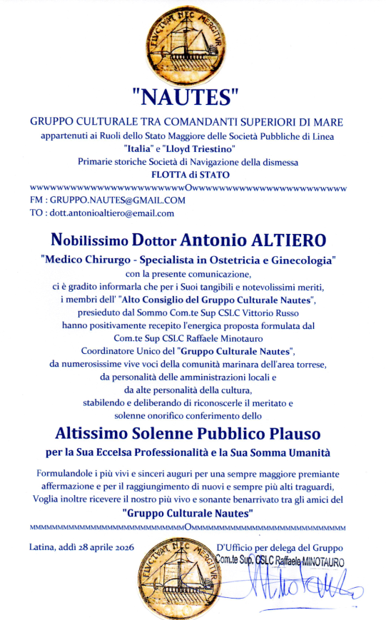 Il conferimento dell’“Altissimo Solenne Pubblico Plauso” al Dottor Antonio Altiero nasce da un moto autentico e travolgente della comunità: cittadini, personalità della cultura, rappresentanti delle istituzioni e numerose voci del mondo marinaro hanno chiesto con insistenza che l’autorevolissimo e illustre ginecologo torrese venisse ufficialmente onorato per la sua straordinaria professionalità e per la sua somma umanità.